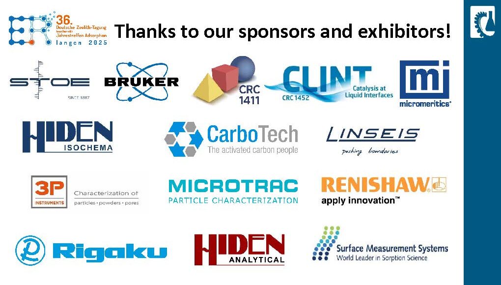 Thanks also goes to our sponsors and exhibitors. We particularly thank our Platinum Sponsor CarboTech, our Gold Sponsors Anton Paar and Linde, our Silver Sponsor Grace, the George-Kokotailo Poster Award Sponsor Clariant and the Poster Award Sponsor CWK.